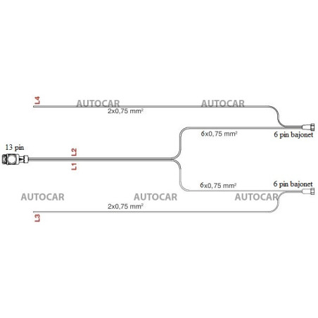 Verkabelung für einen Anhänger mit 13-poligem Stecker und Positionslichtern. Die Verkabelung verfügt über ein 6-poliges Bajonett für eine schnelle und zuverlässige Verbindung der Lichter. (im Bild)