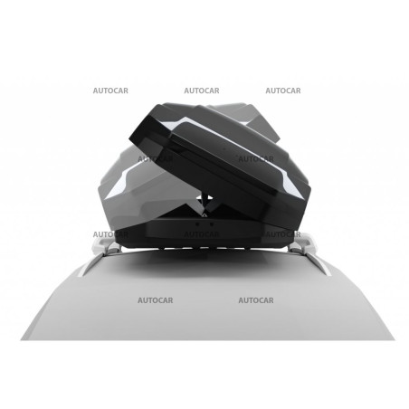 Dachbox mit stilvollem Design und großzügigem Stauraum. Der robuste Deckel ermöglicht ein einfaches Öffnen und Schließen.