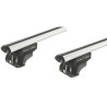 Silberner Träger (120 cm) aus robustem Aluminium. Komplettes Dachträgersystem mit einfacher Montage und arretierbaren Füßen, zur Montage auf klassischen Dachrelingen (offene Reling).