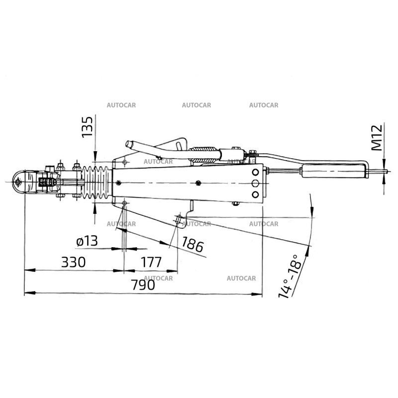Diese Auflaufbremse ist sowohl für die Montage von unten als auch von oben an einer „V“-förmigen Deichsel konzipiert, tj die Bremse kann sowohl von oben als auch von unten an der Deichsel befestigt werden. Die Bremse wird ohne Kupplungsvorrichtung geliefert. Es kann mit einer passenden Kugelkupplung oder Abschleppöse ausgestattet werden.
