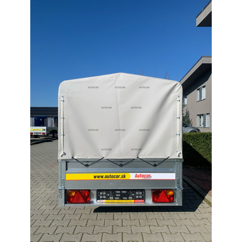 Einachsiger ungebremst Anhänger mit einem Planenaufbau von 1200 mm Höhe ab Anhängerboden. Dieser Anhänger verfügt über eine Vollrahmenkonstruktion mit 6 cm Höhe und drei Querverstärkungen, die auch bei voller Beladung für hohe Festigkeit und Stabilität sorgen. Zur sicheren Befestigung der Ladung befinden sich vier Verzurrösen im Boden. Der Wagen ist mit stabilen, profilierten Seitenwänden aus verzinktem Blech ausgestattet, die eine lange Lebensdauer und Korrosionsschutz gewährleisten. Die hintere bordwand lässt sich öffnen und abnehmen , was das Be- und Entladen von Gütern erleichtert.