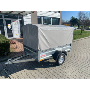 Einachsiger, ungebremst Anhänger mit Flachplane und einer Vollrahmenkonstruktion mit 6 cm Höhe und zwei Versteifungen sorgt für hohe Festigkeit und Stabilität auch bei voller Beladung. Vier Verankerungsösen im Boden dienen zur sicheren Befestigung der Ladung. Der Anhänger ist mit robusten, profilierten Seitenwänden aus verzinktem Blech ausgestattet, die eine lange Lebensdauer und Korrosionsschutz gewährleisten.
