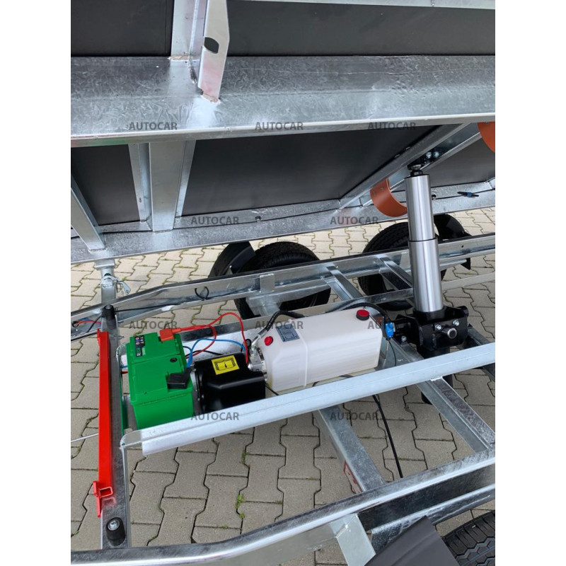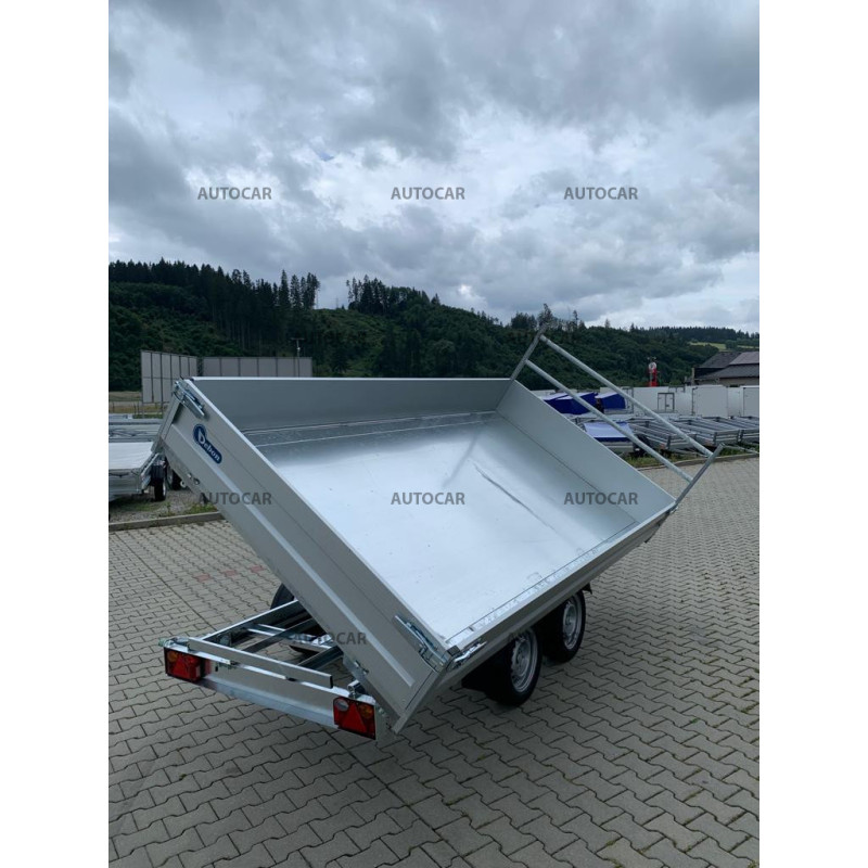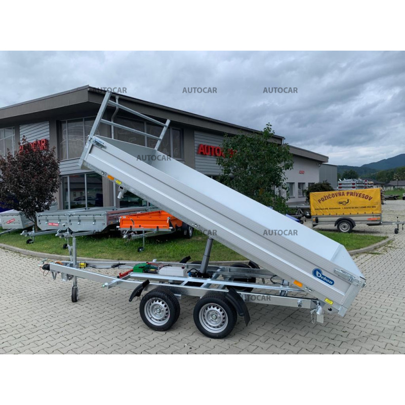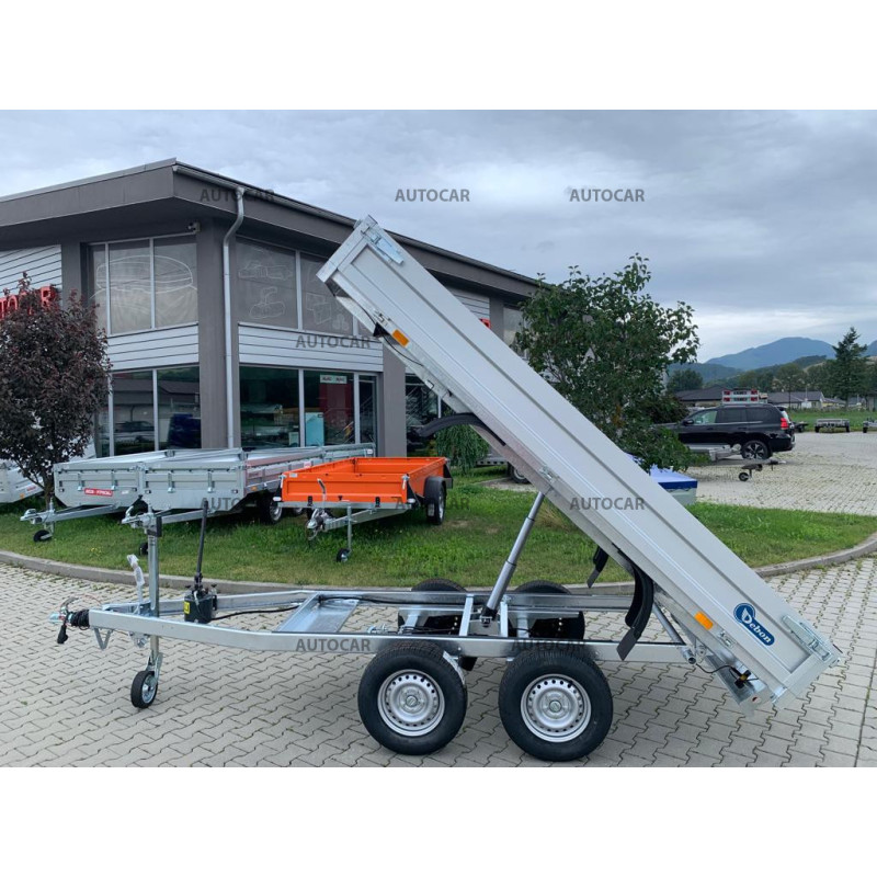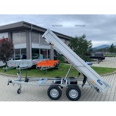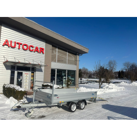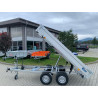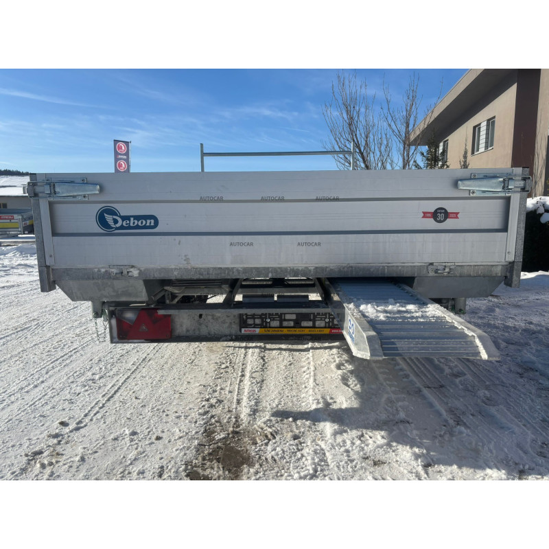 Gebremster, zwei-achse dreiseitiger, hydraulisch klappbarer Anhänger mit unter der Ladefläche verstauten Rädern der französischen Firma Debon Cheval Liberté. Serienmäßig ist er mit abnehmbaren Aluminium-Seitenwänden ausgestattet, die ihn in einen Pritschenanhänger verwandeln. Zusätzlich verfügt er über Aluminiumrampen mit einer Tragfähigkeit von 3 Tonnen (2 x 1,5 t), einer Länge von 2,5 m, einer Rampenbreite von 300 mm und einer maximalen Höhe von 760 mm. Die robuste , feuerverzinkte Stahlkonstruktion garantiert Langlebigkeit. Zur Grundausstattung gehören: elektrisch-hydraulische Klappung , ein Boden aus wasserfestem Sperrholz mit verzinkter Blechabdeckung , ein Stützrad, Fundamentkeile und 8 Verankerungswinkel. Der Anhänger hat 2 Jahre Garantie und ist für eine Höchstgeschwindigkeit von 140 km/h ausgelegt.