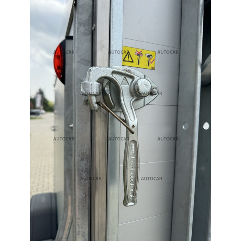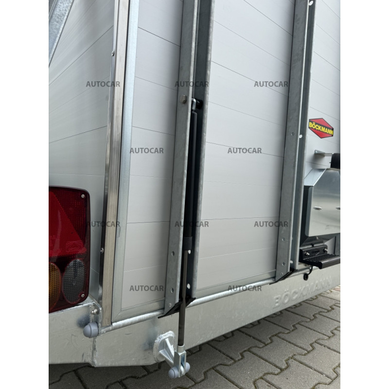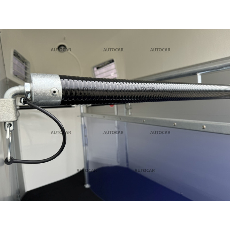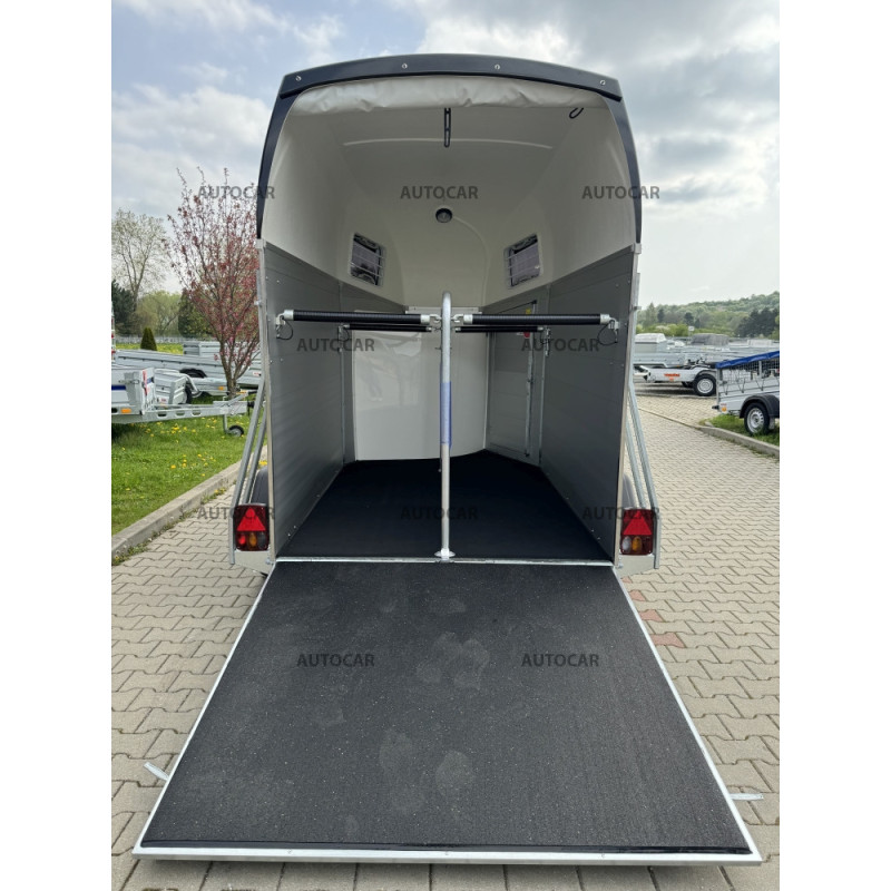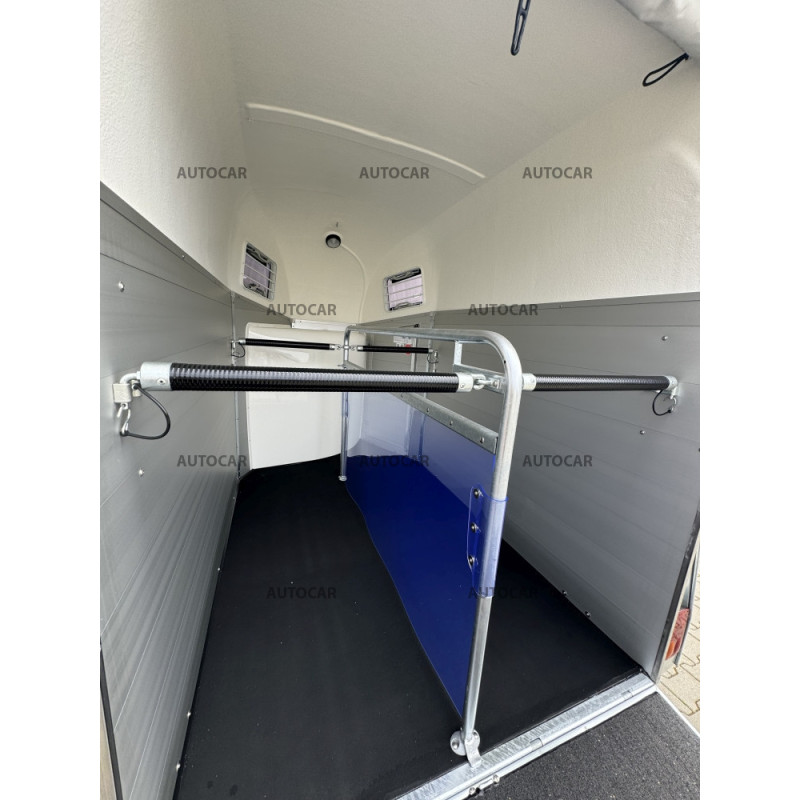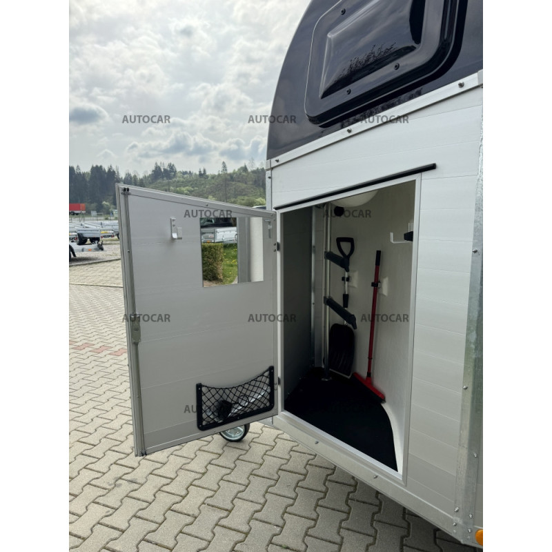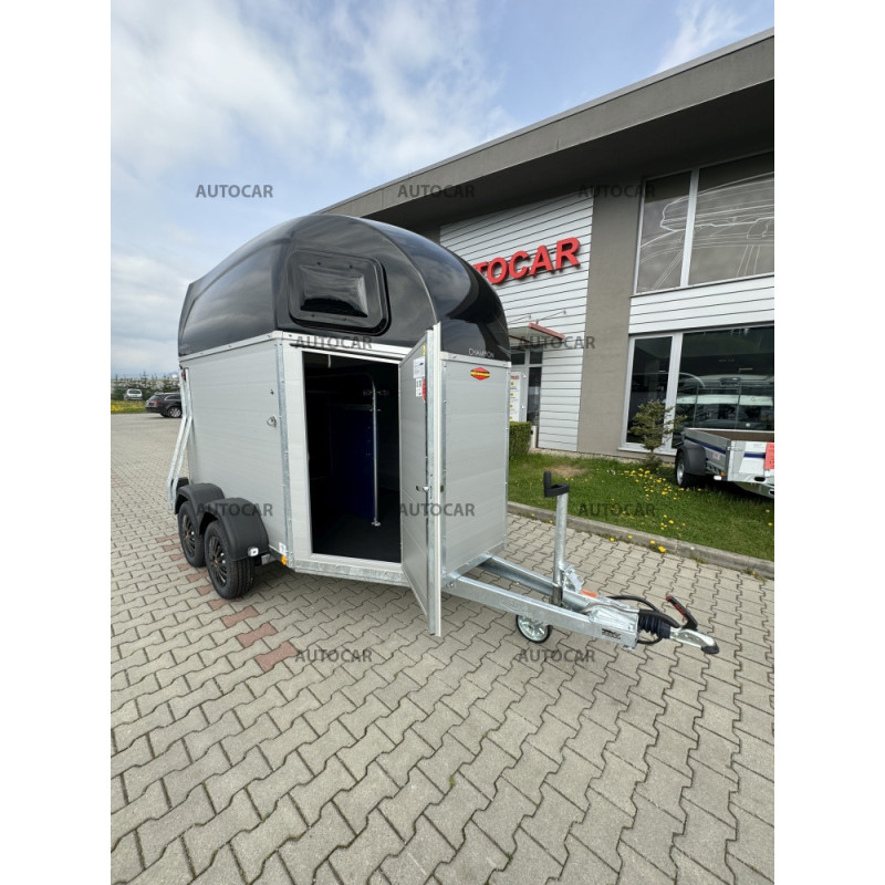 Verzinkter Stahlramen, CFF-Plus Fahrgestell mit daempfer, Alu-Boden, Wende des Anhaengers aus Alu-elox 1500mm hoch, Polyesterhaube in silberStahlic, getoente Fensterscheiben, Innenbeleuchtung, verschliesbare Tuer, Planenlift, Gummiboden verklebt und versiegelt, Gummi auf Beladeklappe mit integrierten Trittleisten und Seitenstop, Trennwand mit PVC-Teil. Sattelkiste mit Sattelhalter, Beseb, Schaufel, Spiegel.