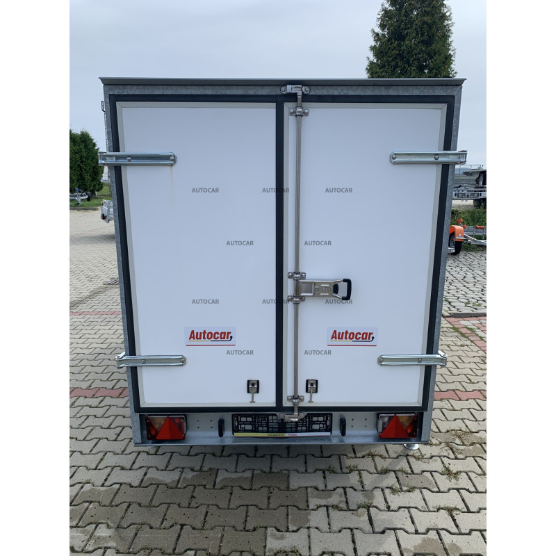 Zweiachsiger gebremster Kastenanhänger mit einer Nutzlast von bis zu 2700 kg ist ein kompaktes und praktisches Transportmittel, das häufig für den Transport verschiedener Ladungen verwendet wird. Die Seitenwände des Anhängers bestehen aus Sperrholz, der Boden ist aus wasserfestem Sperrholz gefertigt. Standardmäßig ist der Anhänger in Weiß gehalten. Der Anhänger ist mit Heck-Doppelflügeltüren und Seitendiensttüren ausgestattet. Zur Grundausstattung gehören Bodenbefestigungen, die zur Sicherung der Ladung mit Gurten oder Seilen verwendet werden, um ein Verrutschen während des Transports zu verhindern. Darüber hinaus verfügen diese Anhänger über hintere Stützbeine, die das Fahrzeug während des Be- und Entladens stabilisieren. Ein weiteres Zubehör sind Unterlegkeile, die zur Sicherung des Anhängerrades verwendet werden. Der Anhänger eignet sich für den Transport von wertvoller Fracht, da er im "Kasten" Schutz vor widrigen äußeren Einflüssen bietet.