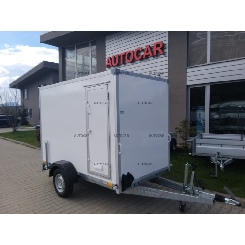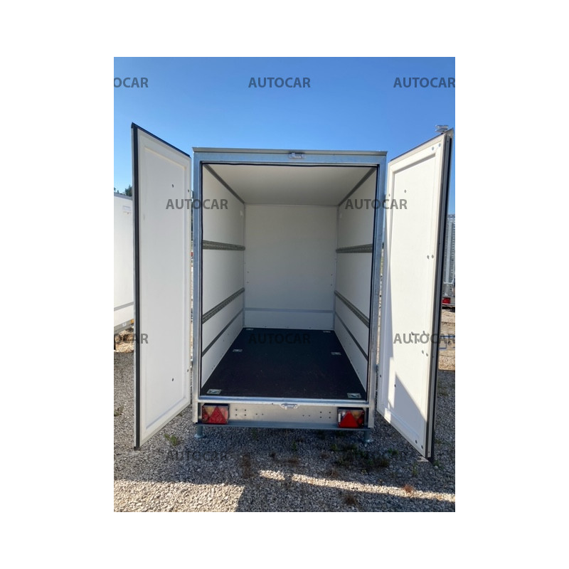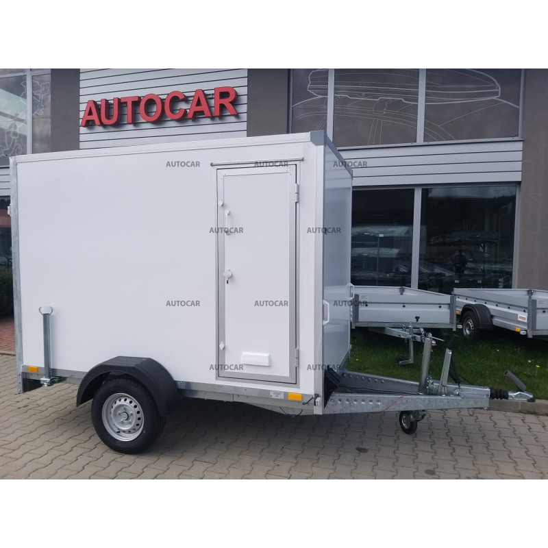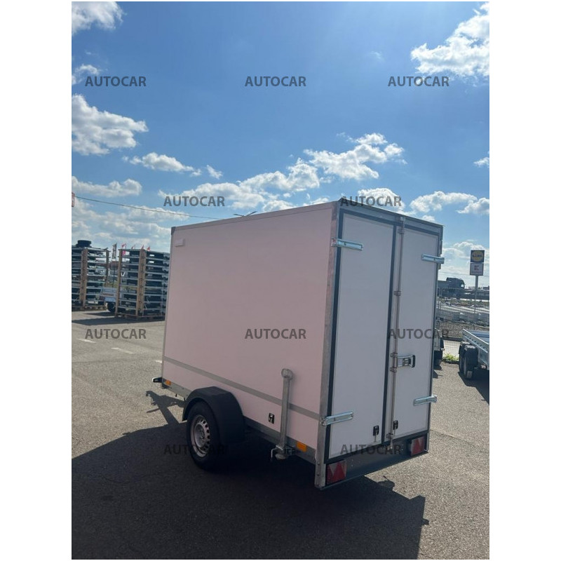 Einachsiger gebremster Kastenanhänger bis 1300 kg ist ein kompakter und praktischer Transporter, der oft für den Transport verschiedener Güter verwendet wird. Die neue Ausführung mit isolierten Wänden (Sandwich) und einem Boden aus wasserfester Sperrholz bietet einen geschlossenen Raum und schützt die Ladung vor widrigen äußeren Einflüssen und Witterungsbedingungen. Die Box ist in der Standardausführung weiß. Der Anhänger ist mit doppelflügeligen Türen und seitlichen Servicetüren ausgestattet. Zur Grundausstattung gehören Befestigungsmöglichkeiten auf dem Boden, die zur Sicherung der Ladung mit Gurten oder Seilen dienen, um Bewegungen während des Transports zu verhindern. Zusätzlich sind die Anhänger mit hinteren Stützen ausgestattet, die das Fahrzeug beim Be- und Entladen stabilisieren. Weiterhin gehören Keile zum Equipment, die zur Sicherung der Anhängerräder verwendet werden, um Bewegungen während des Stehens zu verhindern.