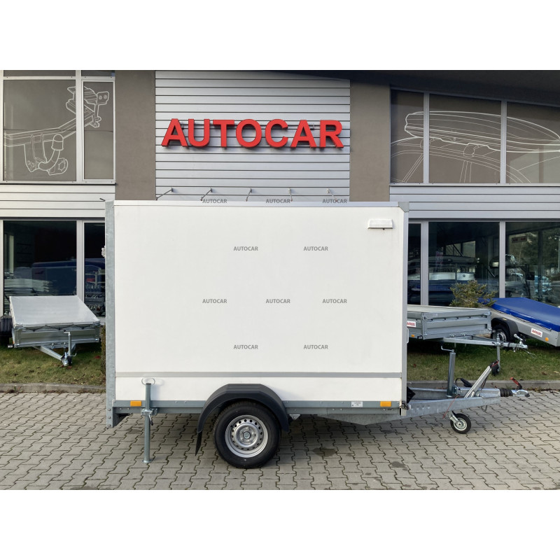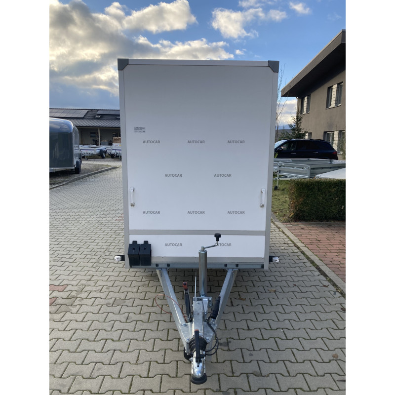 Der einachsige, gebremste Kastenanhänger bis 1300 kg ist ein kompaktes und praktisches Transportmittel, das häufig für den Transport verschiedener Lasten eingesetzt wird. Die neue Konstruktion mit isolierten Wänden (Sandwich) und einem wasserdichten Sperrholzboden bietet einen geschlossenen Raum und gewährleistet den Schutz der Ladung vor rauen äußeren Einflüssen und Wetterbedingungen. Der Schrank ist standardmäßig weiß. Der Anhänger ist mit einer Heckrampe ausgestattet, die als Auffahrrampe dient. Zur Grundausstattung gehören Griffe am Boden, mit denen die Ladung mit Gurten oder Seilen gesichert wird, um ein Verrutschen während des Transports zu verhindern. Darüber hinaus verfügen diese Lkw über hintere Stützbeine, die das Fahrzeug beim Be- und Entladen der Ladung stabilisieren. Ein weiterer Bestandteil sind die Unterlegkeile, mit denen die Räder des Anhängers gesichert werden, damit sie sich im Stand nicht bewegen können.
