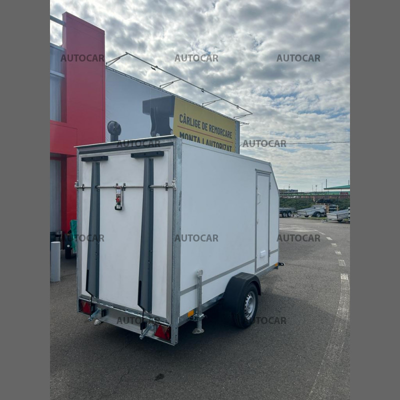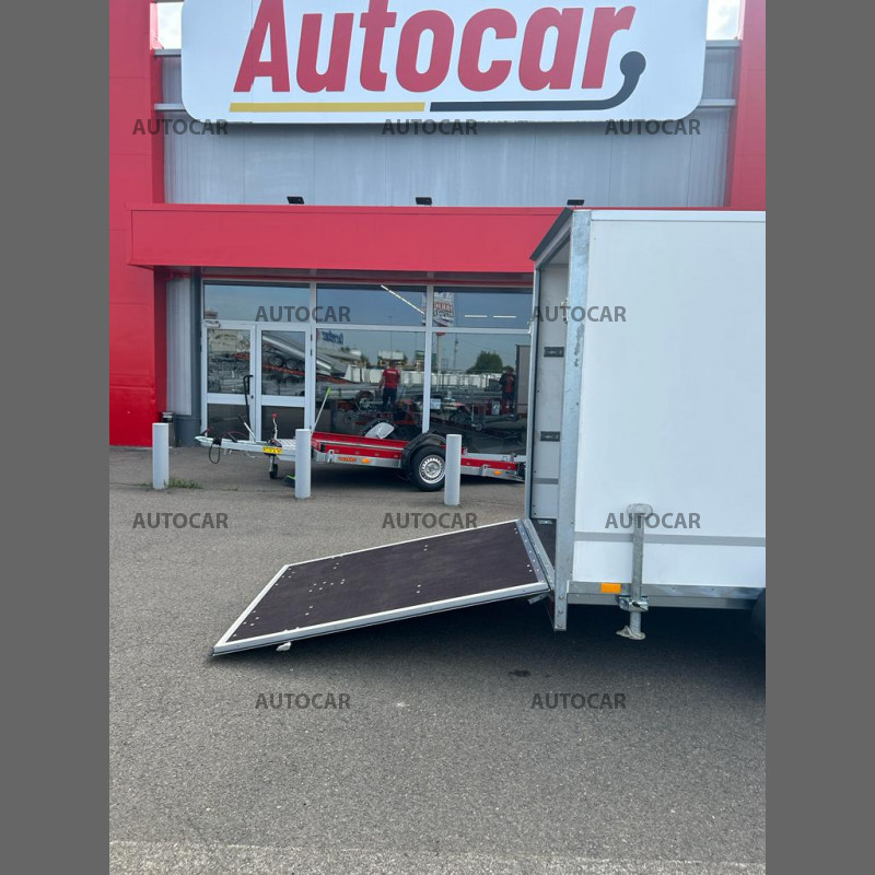 Einachsiger gebremster Kastenanhänger F13301518 mit Rampe, abgeschrägt und mit Seitentüren