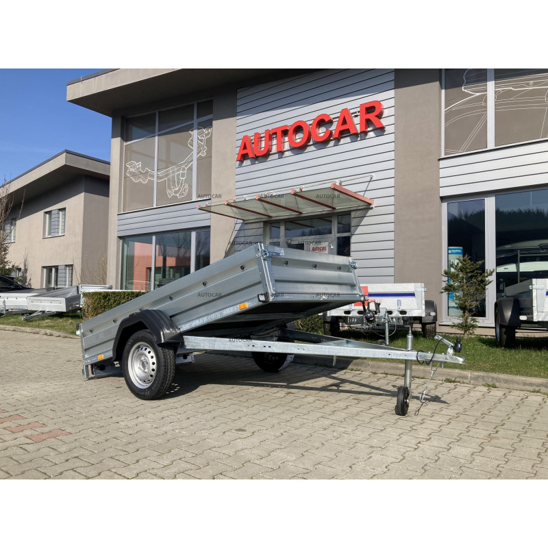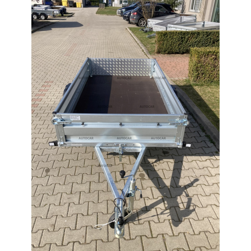 eine-achse ungebremst Klappanhänger mit Pritsche und Rädern neben der Ladefläche. Alle Elemente sind feuerverzinkt – Rahmen, Deichseln, Halterungen. Die langen Achshalterungen werden an drei Befestigungspunkten verschraubt. Der Anhänger hat einen Boden aus wasserdichtem Sperrholz und die Seiten sind kaltgepresst, um eine bessere Festigkeit und Härte der Seite selbst zu gewährleisten. Diese Lösung garantiert eine noch höhere Steifigkeit und Haltbarkeit des Anhängers als die meisten verwendeten Zweipunkt-Sets. anhänger verfügt außerdem über eine Öffnungs- und Entnahmemöglichkeit für die Vorder- und Rückseite.