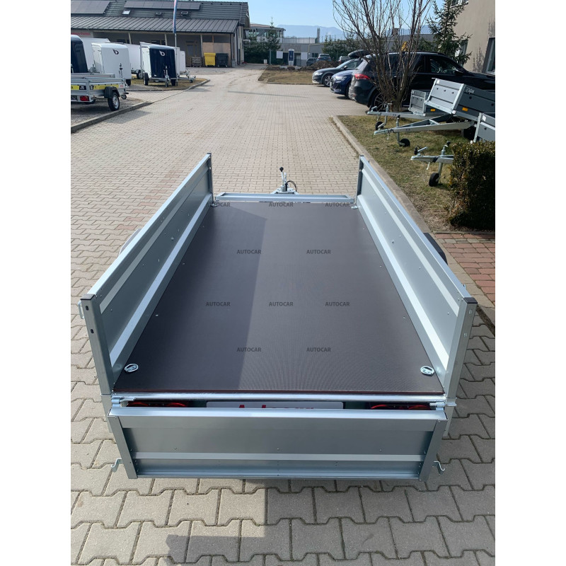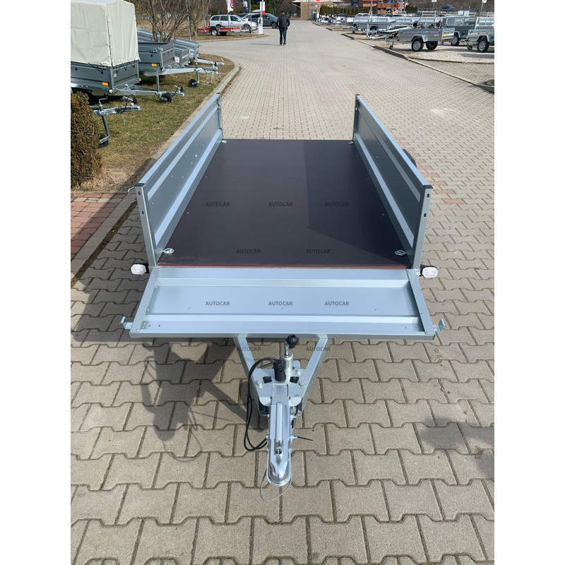 Der faltbare eine-achse ungebremst Anhänger mit robustem geschweißt (7 cm hoch), Querverstärkung und verstärkter Achse und Gelenk bis 1300 kg stellt eine zuverlässige Lösung für den Transport jeglicher Ladung dar. Sein U-Profilrahmen und die C-Profildeichsel bestehen aus bis zu 2,5 mm dickem Material. Seine breite Ladefläche mit den Maßen 2335 x 1330 und einer bordwände von 390 mm, aber das Wichtigste ist die bordwände von bis zu 1 mm, die Stabilität und Haltbarkeit garantiert. Dieser Wagen ist mit einem wasserfesten Sperrholzboden mit Bodenösen ausgestattet. Die klappbare Konstruktion der 8 cm hohen Deichsel ermöglicht ein einfaches Be- und Entladen der Ladung und macht diesen Anhänger für verschiedene Transportzwecke geeignet. anhänger verfügt neben der Kippfunktion auch über eine Frontöffnung und stützrad .