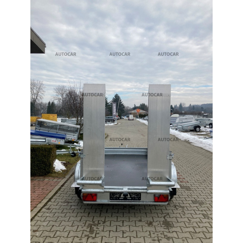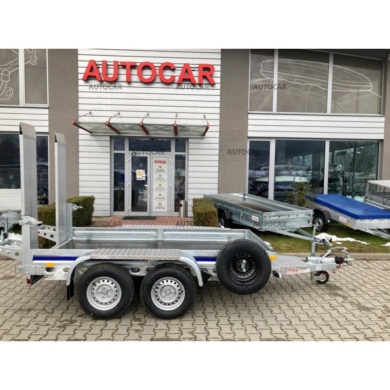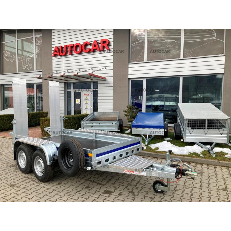 Zweiachsiger gebremster Lastanhänger für den Transport von Baumaschinen mit Rädern, die neben der Ladefläche platziert sind. Einfaches Auffahren der Maschine wird durch Auffahrrampen ermöglicht. Die Konstruktion besteht aus einem robusten, feuerverzinkten, geschweißten Stahlrahmen, der eine lange Lebensdauer garantiert. Standardausstattung: 4x Halterungen zur Befestigung der Maschine, Boden aus wasserfestem Sperrholz, Stützrad, Keile. Der Anhänger hat eine Garantie von 2 Jahren und ist für eine Geschwindigkeit von 130 km/h ausgelegt.