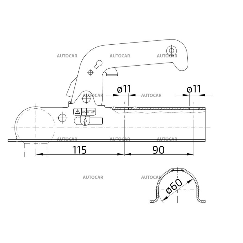 Standard-Anhängekupplung 800 kg für ungebremste Anhänger. Konzipiert für die Montage an einem Rohr mit einem Durchmesser von 60 mm. Der Steuergriff ist mit einem Kompressionsverschluss und einem Loch für ein Schloss ausgestattet. Die Kupplung ist über die gesamte Lebensdauer selbsttätig und muss nicht eingestellt werden. Der Verschleißgrad der Anhängerkupplung oder des Kugelbolzens wird auf der durchsichtigen Seitenanzeige angezeigt.
