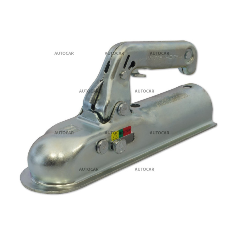 Aufhängegelenk bis 800 kg für Runddeichseln mit einer Größe von 50 mm, einer maximalen Stützlast von 75 kg und einem Abstand der Befestigungslöcher von 90 mm. Der Griff ist mit einem Push-Lock und einem Schloss für den Anhänger ausgestattet.
