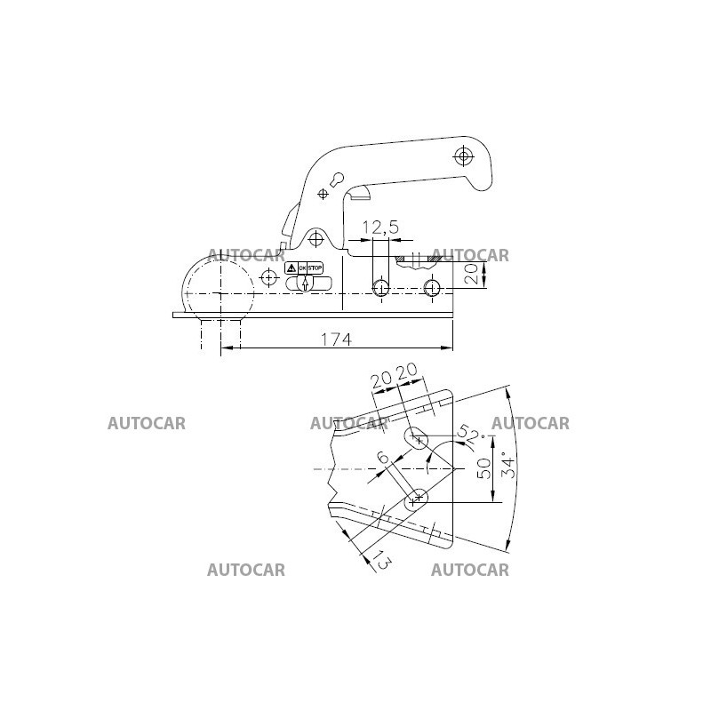 Anhängerkupplung für ungebremste Anhänger bis 750kg. Vorgesehen für die Montage an „V“-Deichseln mit seitlichen Löchern im Abstand von 40 mm und oberen Befestigungslöchern im Abstand von 50 mm. Der Steuergriff ist mit einem Kompressionsverschluss und einem Loch für ein Schloss ausgestattet. Die Kupplung ist über die gesamte Lebensdauer selbsttätig und muss nicht eingestellt werden. Der Verschleißgrad der Anhängekupplung bzw. des Kugelbolzens wird auf der übersichtlichen Seitenanzeige angezeigt.