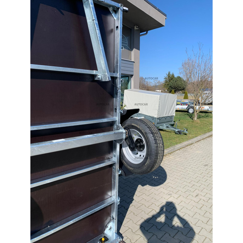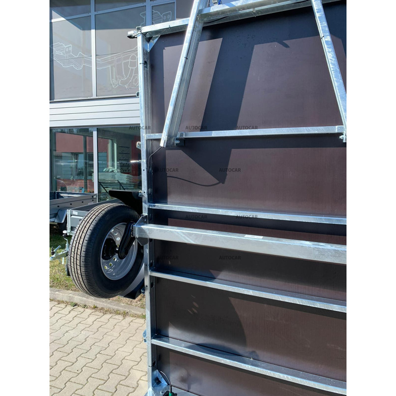 Zweiachsiger gebremst anhänger mit robustem geschweißt (8 cm) und Querverstärkung sorgt für Stabilität und Langlebigkeit. Die Ladefläche von 2630 × 1540 mm mit 390 mm Seitenwänden (1 mm dick) bietet viel Platz. Der wasserdichte Sperrholzboden mit Ösen ermöglicht eine sichere Befestigung der Ladung. Der Anhänger verfügt über eine klappbare Deichselkonstruktion (11 cm) zum einfachen Beladen, eine nach vorne zu öffnende Front und stützrad . Ein zuverlässiger und praktischer Helfer für den Transport verschiedener Lasten.