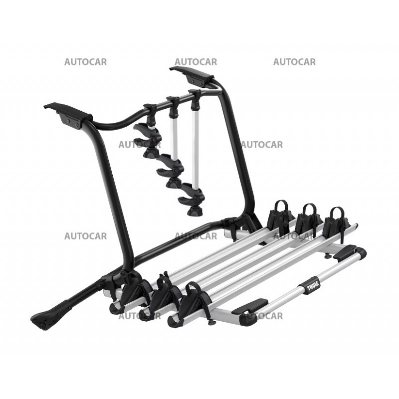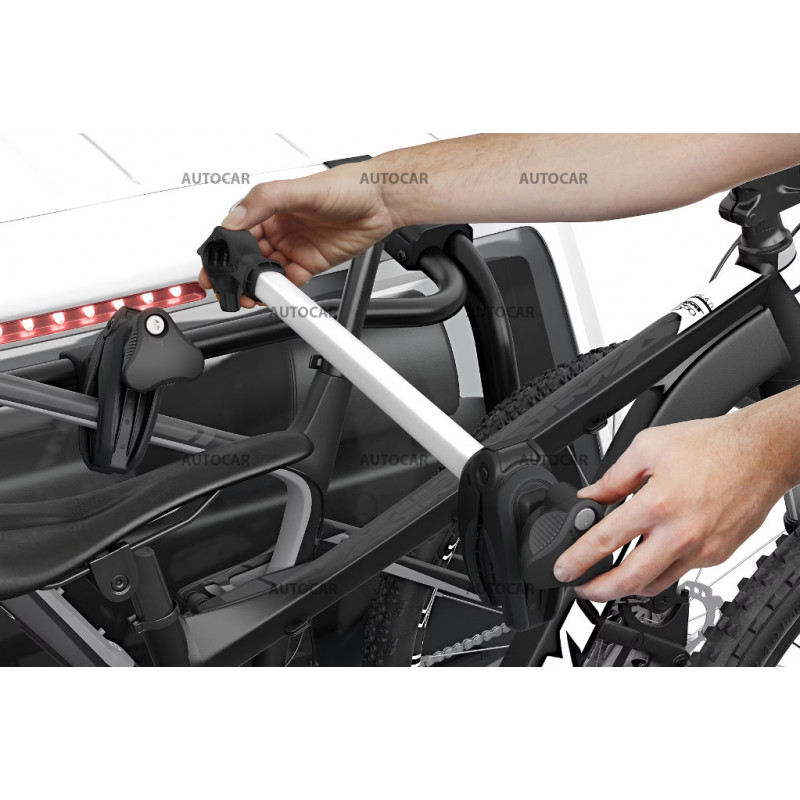 Einfache Aufladung der Fahrräder durch abnehmbare Fahrradhaltearme mit abschließbaren Thule AcuTight-Drehmomentbegrenzer-Knöpfen, die klicken, wenn das optimale Drehmoment erreicht ist