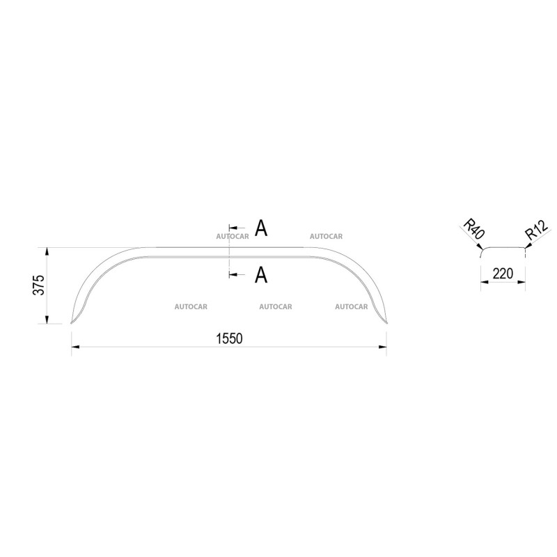 Der Kotflügel besteht aus hochwertigem verzinktem Stahl. Der Kotflügel hat eine Spannweite von 1500 mm, eine Höhe von 375 mm und eine Breite von 220 mm.