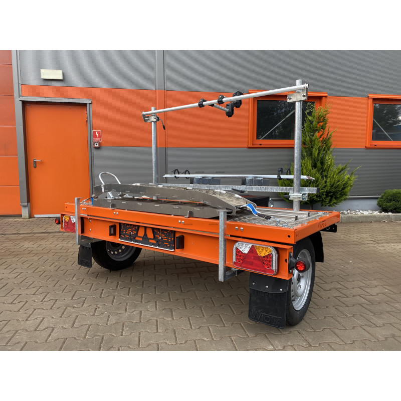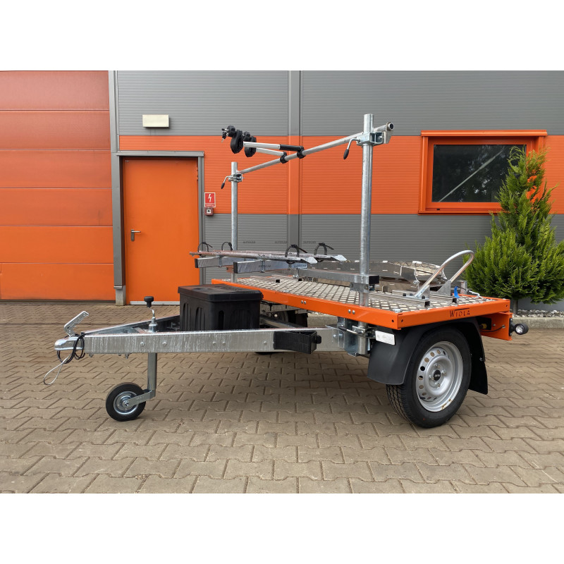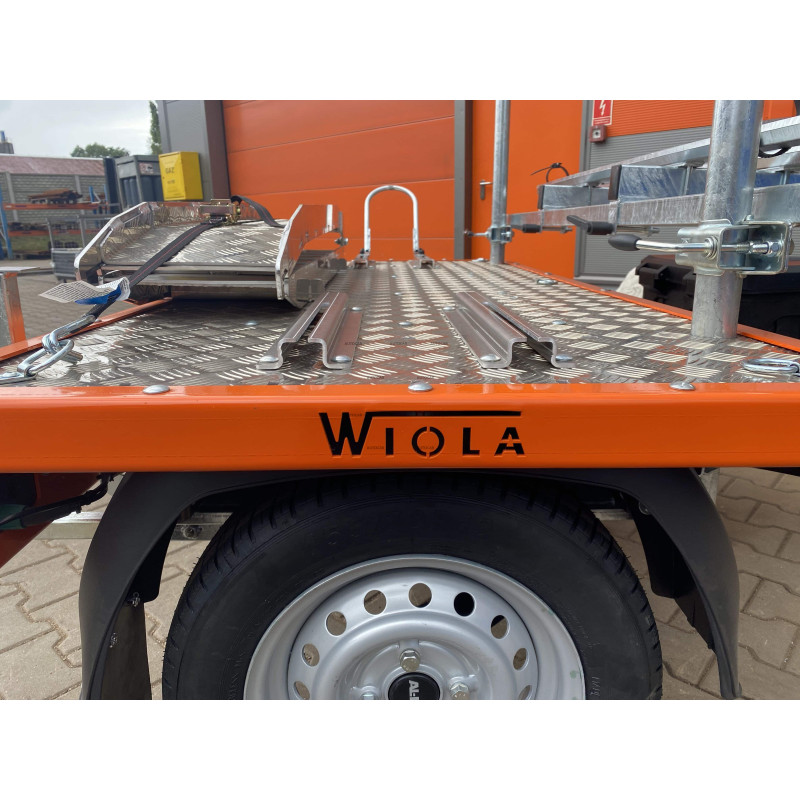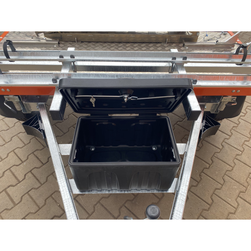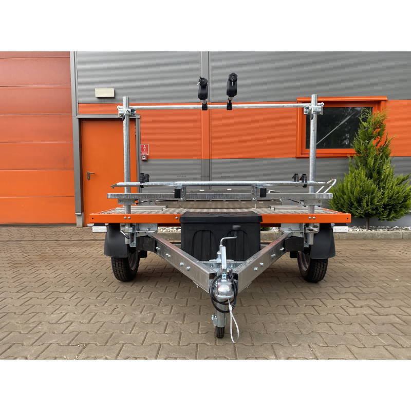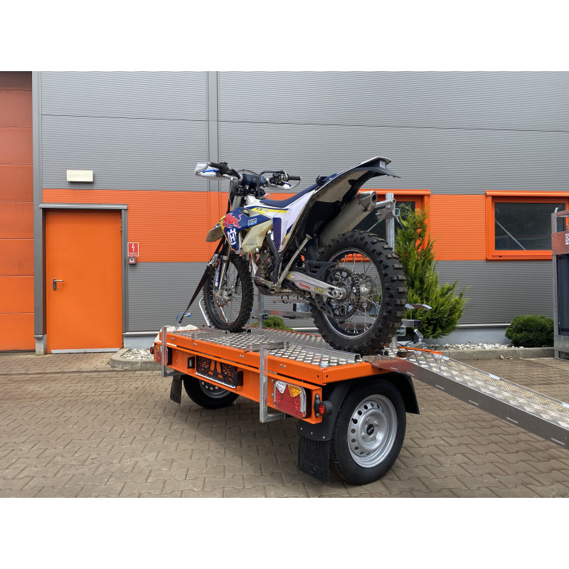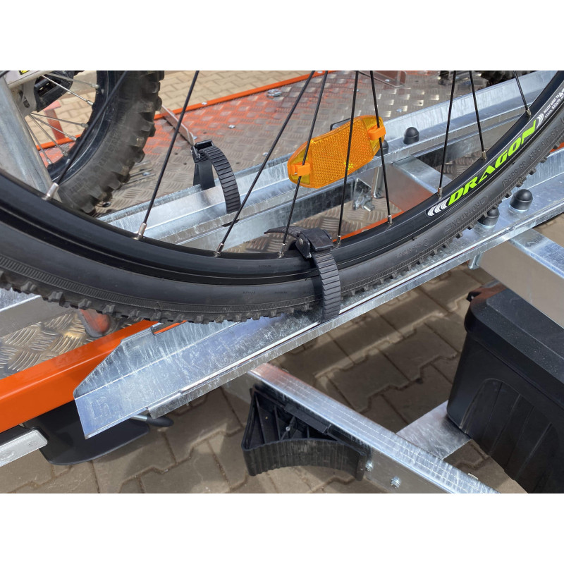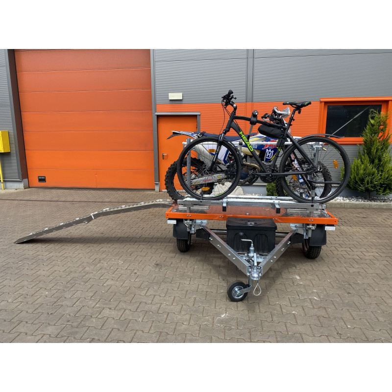 Die obere Aluminiumkonstruktion zusammen mit dem Boden aus Riffelblech ist mit 6 Bodenhalterungen ausgestattet. Der Motorradhalter hat einen verstellbaren Abstand, wodurch er an die Länge des Motorrads angepasst werden kann. Der Rahmen der oberen Konstruktion wurde orange pulverbeschichtet. Im vorderen Teil befinden sich 2 Fahrradhalterungen mit Rinne und Befestigungsgurt für die Räder sowie einem Bügel zur Befestigung des Fahrradrahmens – alles ist mit einem Schloss abschließbar.