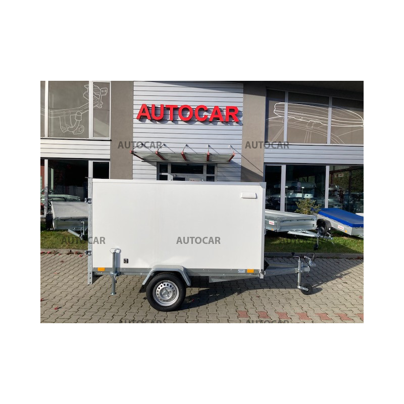 Der einachsige ungebremst Kofferanhänger bis 750 kg ist ein kompaktes und praktisches Transportmittel, das häufig zum Transport verschiedener Lasten eingesetzt wird. Die Wände des Anhängers bestehen aus Sperrholz, der Boden aus wasserfestem Sperrholz. In der Standardausführung ist der Schrank weiß. Der Anhänger ist mit Doppeltüren ausgestattet. Zur Grundausstattung gehören Anker am Boden, die dazu dienen, die Ladung mit Gurten oder Seilen gegen Verrutschen während des Transports zu sichern. Darüber hinaus verfügen diese LKWs über hintere Stützbeine, die das Fahrzeug beim Be- und Entladen stabilisieren. Ein weiterer Bestandteil sind die Unterlegkeile, die dazu dienen, das Anhängerrad zu sichern und zu verhindern, dass es sich im Stand bewegt.