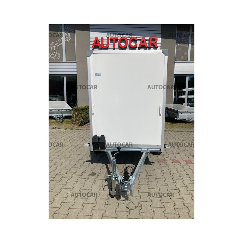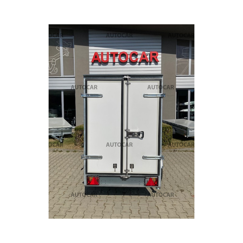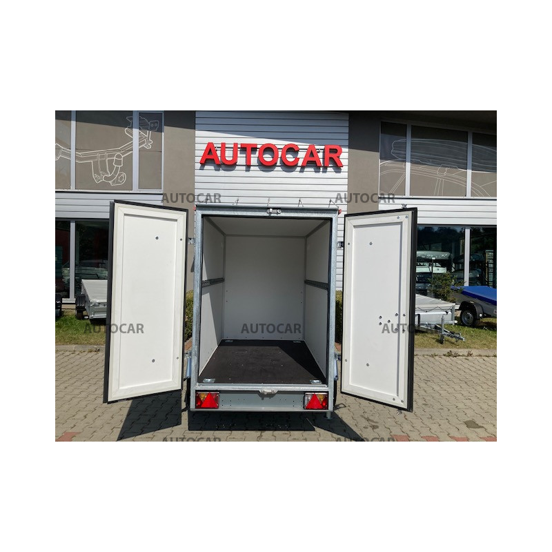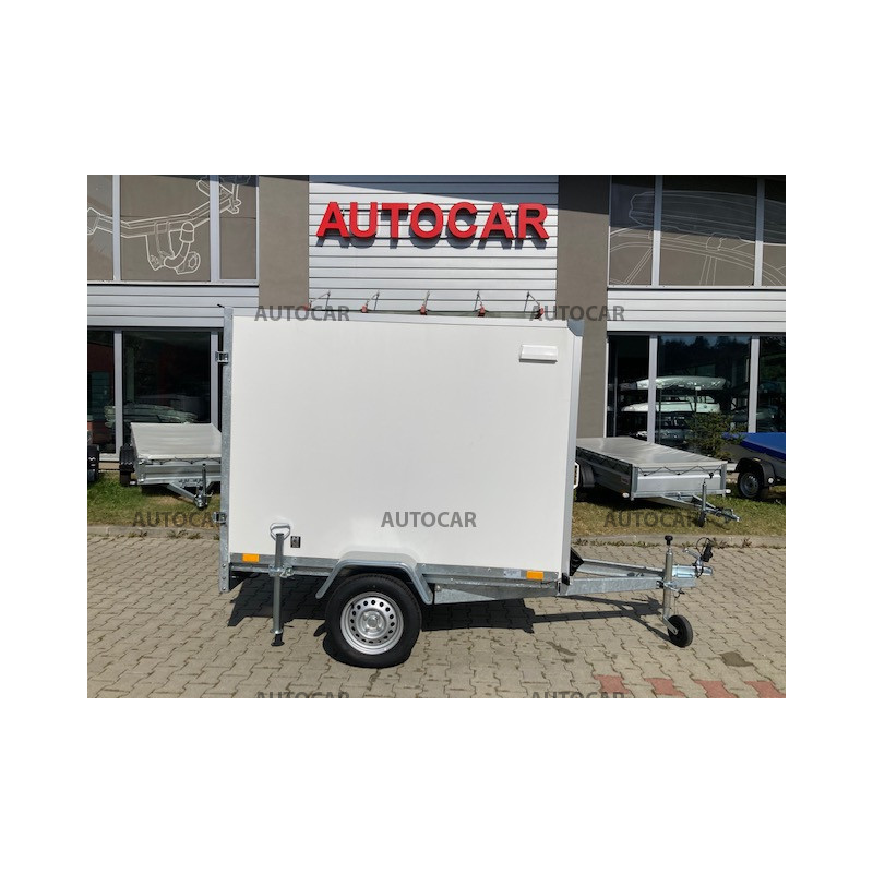 Der einachsige ungebremst Kofferanhänger bis 750 kg ist ein kompaktes und praktisches Transportmittel, das häufig zum Transport verschiedener Lasten eingesetzt wird. Die Wände des Anhängers bestehen aus Sperrholz, der Boden aus wasserfestem Sperrholz. In der Standardausführung ist der Schrank weiß. Der Anhänger ist mit Doppeltüren ausgestattet. Zur Grundausstattung gehören Verankerungen am Boden, die dazu dienen, die Ladung mit Gurten oder Seilen gegen Verrutschen während des Transports zu sichern. Darüber hinaus verfügen diese LKWs über hintere Stützbeine, die das Fahrzeug beim Be- und Entladen stabilisieren. Ein weiterer Bestandteil sind die Unterlegkeile, die dazu dienen, das Anhängerrad zu sichern und zu verhindern, dass es sich im Stand bewegt.