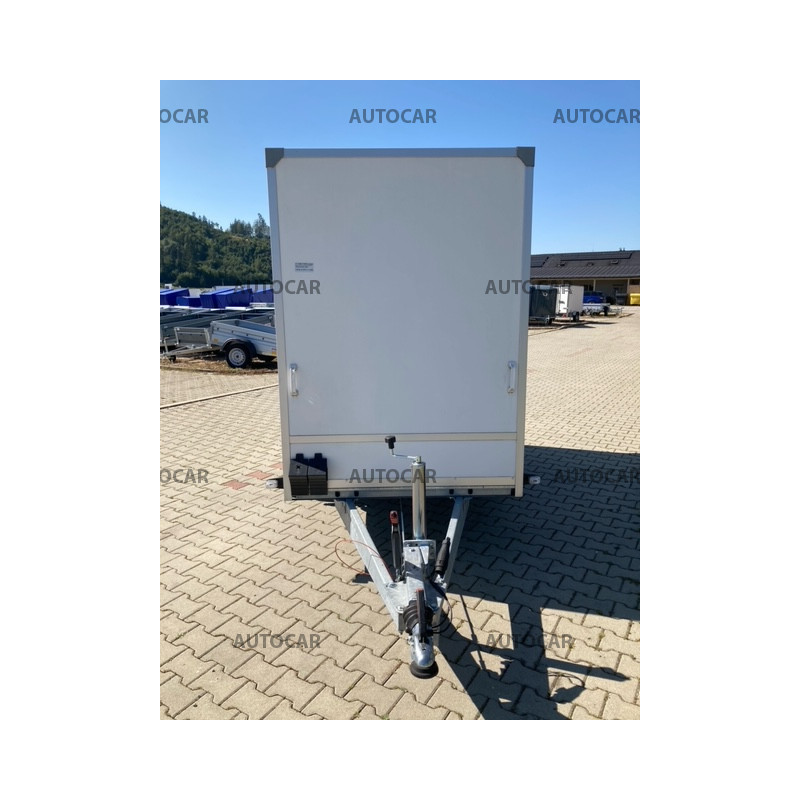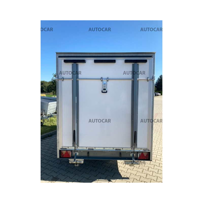 Der einachsige ungebremst Kofferanhänger bis 750 kg ist ein kompaktes und praktisches Transportmittel, das häufig zum Transport verschiedener Lasten eingesetzt wird. Die Wände des Anhängers bestehen aus Sperrholz, der Boden aus wasserfestem Sperrholz. In der Standardausführung ist der Schrank weiß. Der Anhänger ist mit einer Heckrampe ausgestattet, die als Rampe dient. Zur Grundausstattung gehören Verankerungen am Boden, die dazu dienen, die Ladung mit Gurten oder Seilen gegen Verrutschen während des Transports zu sichern. Darüber hinaus verfügen diese LKWs über hintere Stützbeine, die das Fahrzeug beim Be- und Entladen stabilisieren. Ein weiterer Bestandteil sind die Unterlegkeile, die dazu dienen, das Anhängerrad zu sichern und zu verhindern, dass es sich im Stand bewegt.